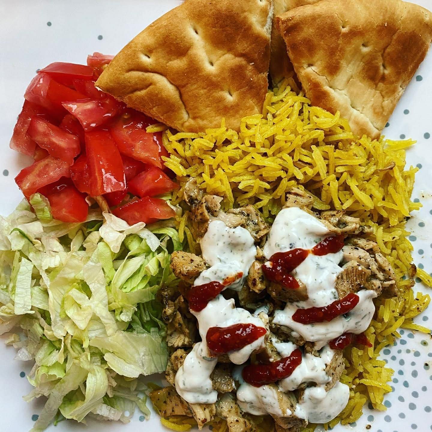 To serve: Return the entire contents of the chicken bowl (chicken, marinade, and all juices) to the skillet. Cook over medium-high heat, stirring occasionally, until heated through. To serve, divide the rice, lettuce, tomato, and toasted pita bread (if desired) evenly among four to six plates. Pile the chicken on top of the rice. Top generously with the white sauce and hot sauce. Serve immediately.